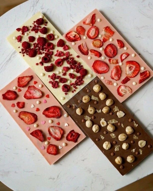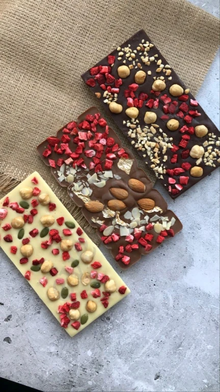 Шоколадная плитка сделана из натурального бельгийского шоколада Callebaut. В наличии шоколад: белый, молочный светлый, тёмный и карамельный. Так же, есть различные добавки орешки, посыпки, малина, клубника